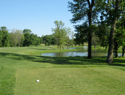 The shortest par 4 on the course, but certainly not the easiest. There are water hazards on the right and left all the way down and behind the hole. The approach area directly in front of the green is level and the ball can roll onto the narrow two-tier green. The right side of the green drops off quickly into a sand trap on the front side or the water. The left side is safer – but go too far left and you’ll be in the hazard near the river.