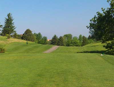Hole number 6 is a par 4 dog leg right, the tee shot selection is everything on this hole. If your drive stays short of the 150 yard marker you will have a wide landing area, but anything past the marker must fade right to follow the dog leg. The approach to the green is guarded by many large trees and the distance can be difficult to judge with the elevation change in front of the green.